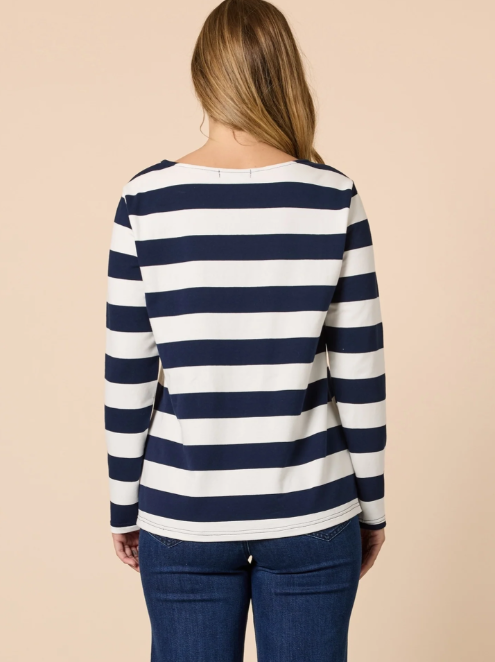 • This classic navy and ivory striped top features a playful heart motif embroidered with colourful thread work, bringing a hint of fun to an everyday essential.