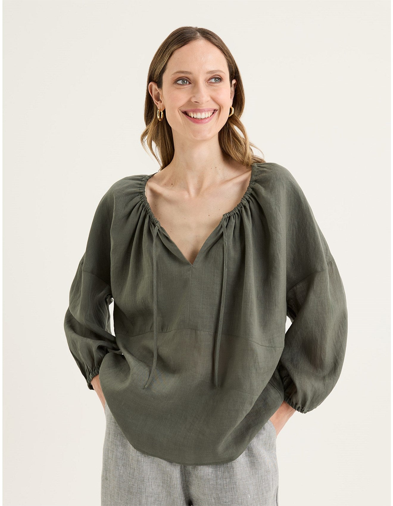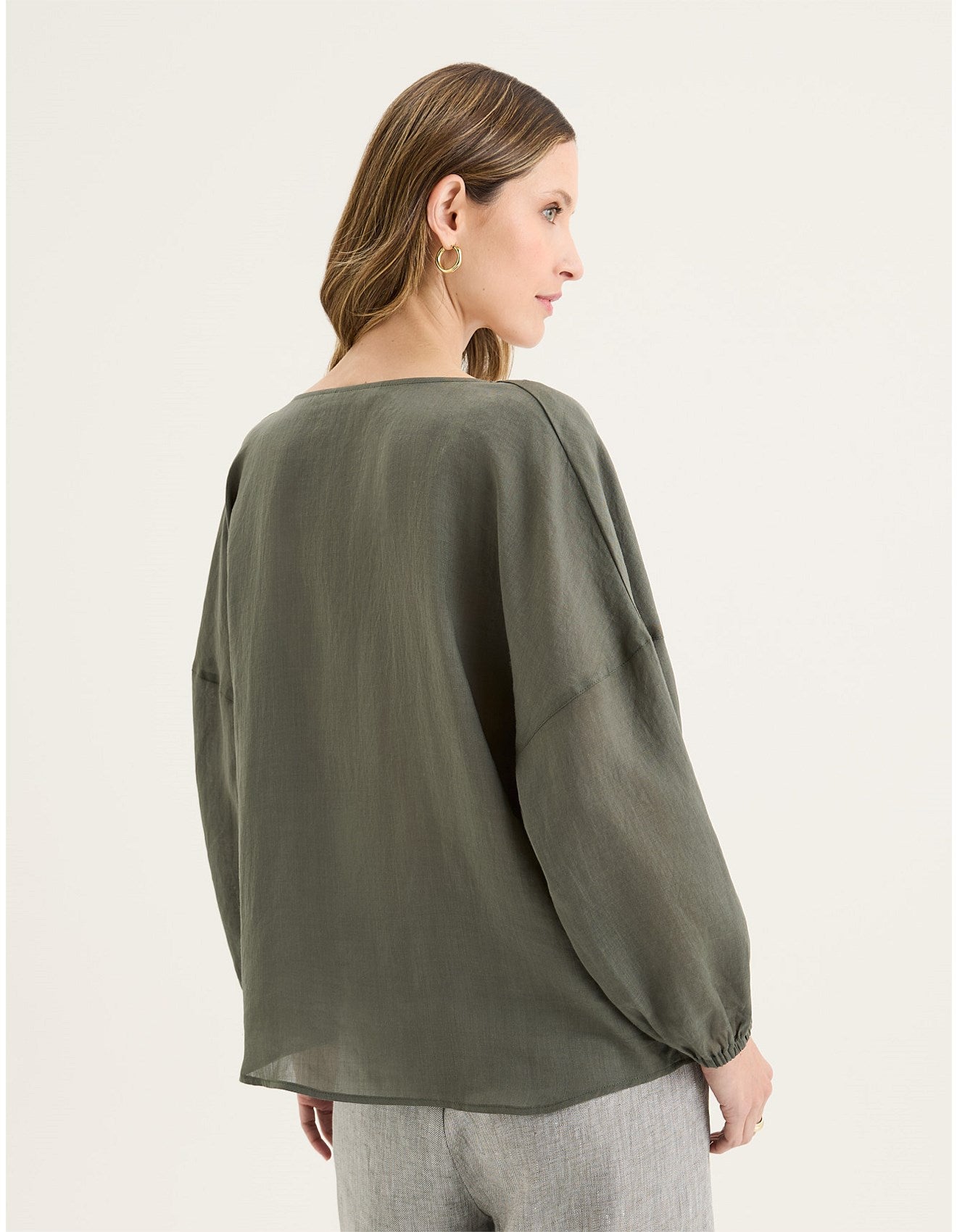 The Bohdi Top blends soft, bohemian-inspired flow with classic Yarra Trail detail. Crafted from a lustrous ramie-tencel blend, it drapes beautifully and moves with ease, offering a lightweight linen-like texture. The cut-away round neckline can be styled two ways - worn open for a relaxed V-neck effect, or drawn in with the encased drawstring for a softly gathered, rounded shape. Featuring a double-layered front yoke for structure, drop-shoulder sleeves with elastic cuffs for volume, and a high-low hem to enhance the flattering silhouette, it’s a versatile piece that is equally suited to casual days or elevated layering.